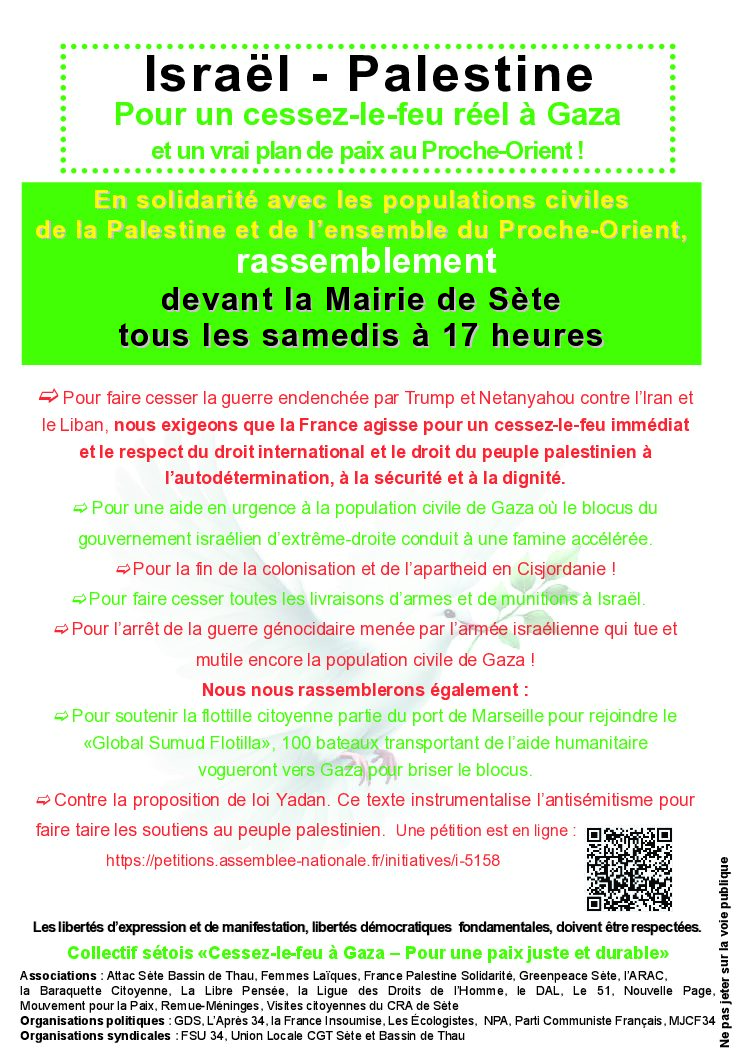 Collectif sétois «Cessez-le-feu à Gaza – Pour une paix juste et durable» est composé d’ associations (Attac Sète Bassin de Thau, Femmes Laïques, France Palestine Solidarité, Greenpeace Sète, l’ARAC, la Baraquette Citoyenne, La Libre Pensée, la Ligue des Droits de l’Homme, le DAL, Le 51, Nouvelle Page, Mouvement pour la Paix, Remue-Méninges, Visites citoyennes du CRA de Sète), d’ organisations politiques (GDS, L’Après 34, la France Insoumise, Les écologistes, NPA, Parti Communiste Français, MJCF34) et d’ organisations syndicales (FSU 34, Union Locale CGT Sète et Bassin de Thau)