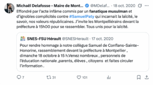 Comme dirait l’autre, remettons l’église au milieu du village. Qu’a dit Nathalie Oziol, en réaction à un tweet de Michaël Delafosse ? « Je ne suis pas d’accord pour qu’on dise… c’est un fanatique musulman », ce qui, replacé dans son propos, voulait dénoncer la confusion entre foi et crime islamiste. La députée, enseignante comme l’est Michaël Delafosse, ajoutait en témoignant des difficultés des professeurs : « ce n’est pas une question de religion… c’est une question de hiérarchie, de moyens, de comment le gouvernement considère l’éducation nationale. » Elle ne disait pas à l’époque autre chose que Ghaleb Bencheikh, membre du « Conseil des sages de la laïcité et des valeurs de la République » créé par Jean Michel Blanquer, auditionné par la commission parlementaire sur « les liens entre mouvement politique et islamisme ». Il alerte cette commission sur les abus de langage qui confondent islam et islamisme, stigmatisent tout ce qui a trait à l’islam, et gomment du même coup la spécificité de l’islamisme politique dont les actes terroristes tombent eux sous le coup de la loi.