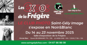 Le club Saint Gély Image présente sa 2e exposition annuelle du 14 au 23 novembre 2025, à la salle d’exposition de la Frégère (457 Grand Rue, Saint-Gély-du-Fesc). Une soixantaine de clichés en noir et blanc, tous formats confondus, inviteront à un voyage à travers les regards et sensibilités des photographes du club.